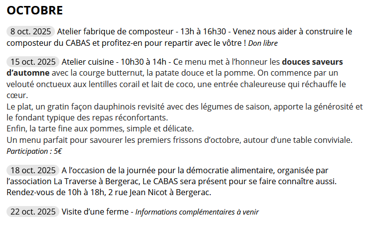 Le programme mensuel est disponible au camion, au local, dans notre lettre-infos et sur demande pour les personnes intéressées, merci de nous envoyer un mail.